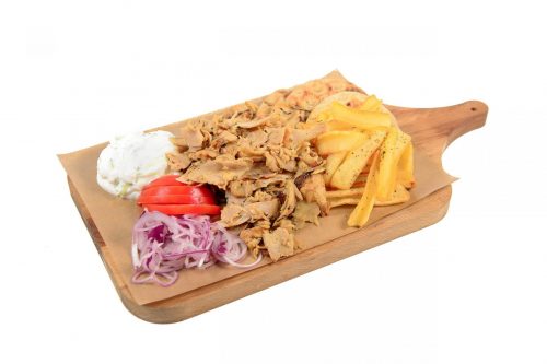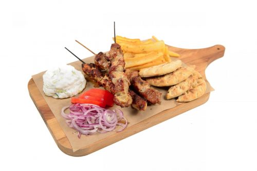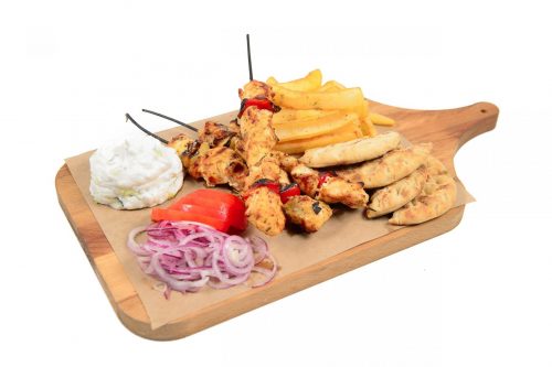 Doua frigarui cu piept de pui invelit in bacon, cartofi prajiti, tzatziki, rosii, ceapa rosie si doua mini lipii sau o portie de bagheta la gratar